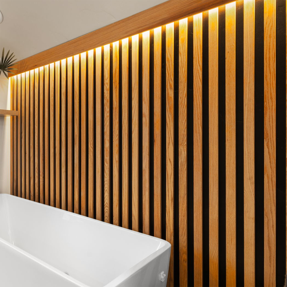 Bougie Accent Wall - Vertical Wood Slats Over Black Painted Wall & White LED Tape w/ Dimmer/Driver